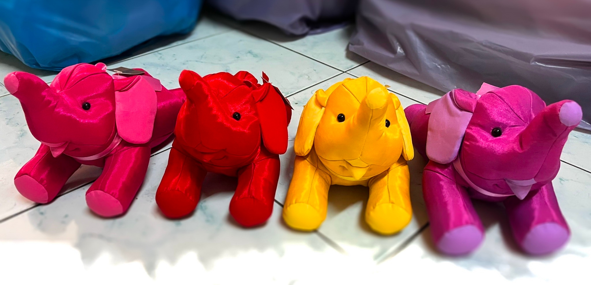 ตุ๊กตาช้างที่ทาง คิง เพาเวอร์ เลือกมาขายมีด้วยกัน 6 สี เป็นช้างทั้งท่านั่ง ท่ายืน ท่าหมอบ และมีหมอนที่เป็นเหมือนตัวช้างทั้งตัว เวลานอนก็จะมีหัวช้างน่ารักๆ ให้มอง “ส่วนใหญ่ คิง เพาเวอร์ จะเลือกแบบที่มีอยู่แล้ว แต่จะมีบางตัวที่เขาแนะนำ เช่น ให้ตัวเป็นสีหนึ่งแล้วหูสีเปลี่ยนไป บางอันก็มีลูกเล่นที่ปรับนิดเดียวแต่ดูเก๋และโมเดิร์นขึ้น จะติดแบรนด์เป็น King Power เลย ให้ขายเฉพาะที่นี่ที่เดียวเท่านั้น”