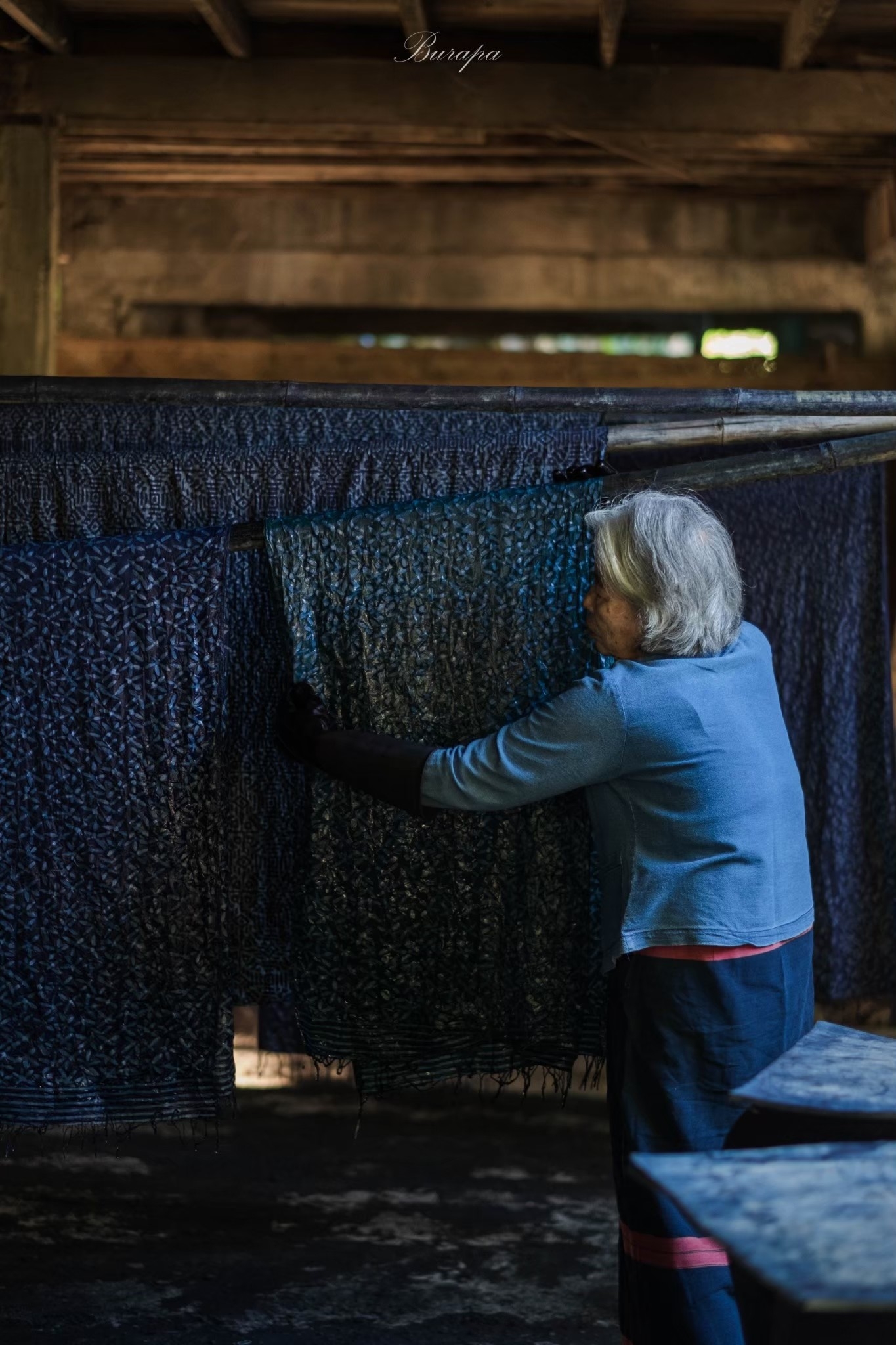 “สมัยยายกับแม่จะย้อมสีพื้นอย่างเดียว เพราะลูกค้าจะเป็นคนทางภาคเหนือ เขาใส่ทำงานจึงอยากได้ผ้าหนาทนทานเหมือนผ้ายีนส์ หม้อย้อมก็อยู่ใต้ถุนบ้านมาตั้งแต่ยุคแรกๆ เลย มีอยู่เกือบ 20 หม้อ บางหม้อนี่อายุ 50 ปีได้เลยนะคะ บางหม้อก็เก่า หมดสภาพไปบ้างแล้ว แต่ละหม้อให้โทนสีไม่เหมือนกัน เคยมีนักวิชาการมาทดลองส่งเสริมวิธีย้อมที่ได้มีคงที่เหมือนกัน แต่เราก็ยังเลือกงานมือที่แต่ละผืนไม่เท่ากันเป๊ะ เป็นเสน่ห์ของผ้าแต่ละผืน”