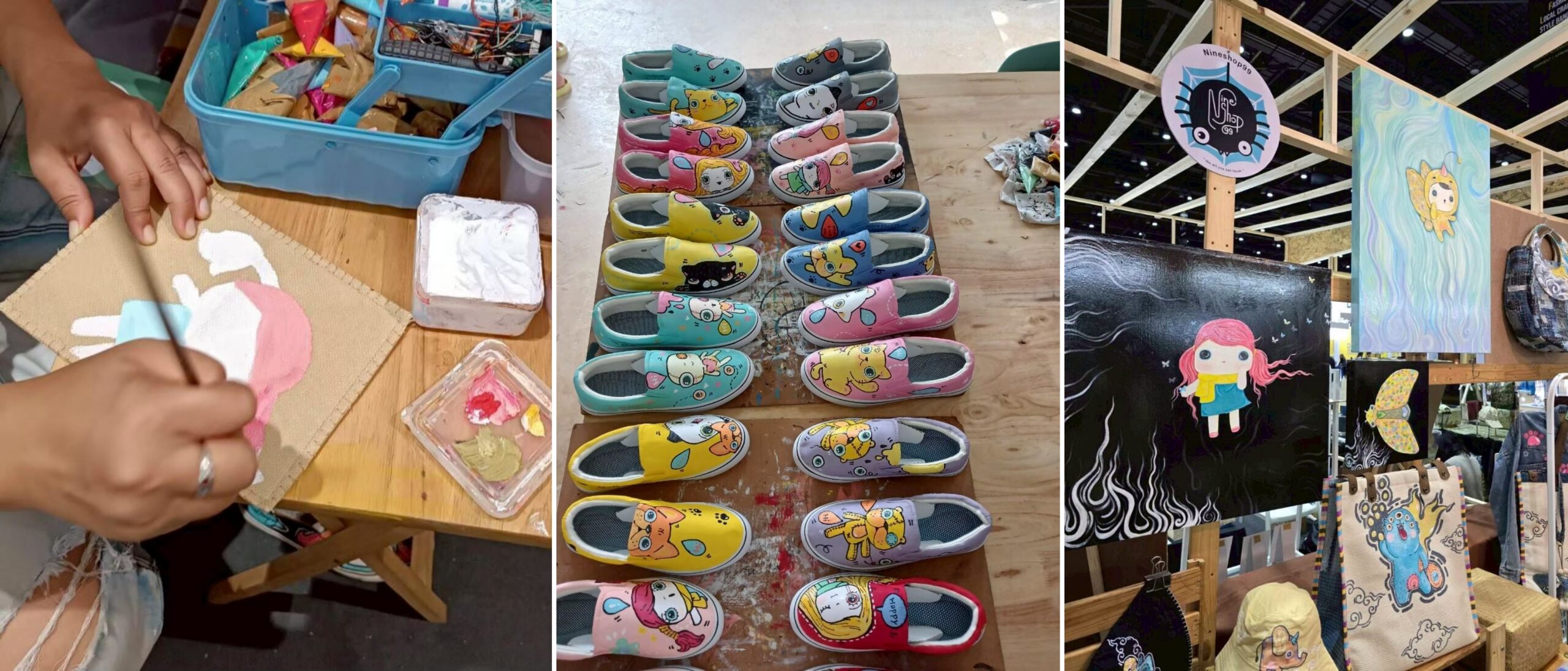 เสน่ห์ของ NineShop99 คืองานวาดมือทีละชิ้น ถ่ายทอดอารมณ์ ความทะเล้นน่ารักผ่านตัวการ์ตูน ทำให้ลูกค้ารู้สึกเชื่อมโยงกับวัยเด็กหรือลูกหลานของเขา เน้นโทนสีสดใส ใช้งานได้จริง เพราะสีที่ใช้เป็นสูตรเฉพาะที่คุณแหม่มคิดค้นเอง ซักได้และทนต่อการใช้งาน อีกหนึ่งไอเดียที่โดดเด่นคือ การขายรองเท้าเป็นข้าง ลูกค้าสามารถเลือกจับคู่ได้เองตามใจชอบ แต่ต้องเป็นไซซ์เดียวกัน ซึ่งเกิดจากตัวตนของคุณแหม่มที่ไม่ชอบเหมือนใคร