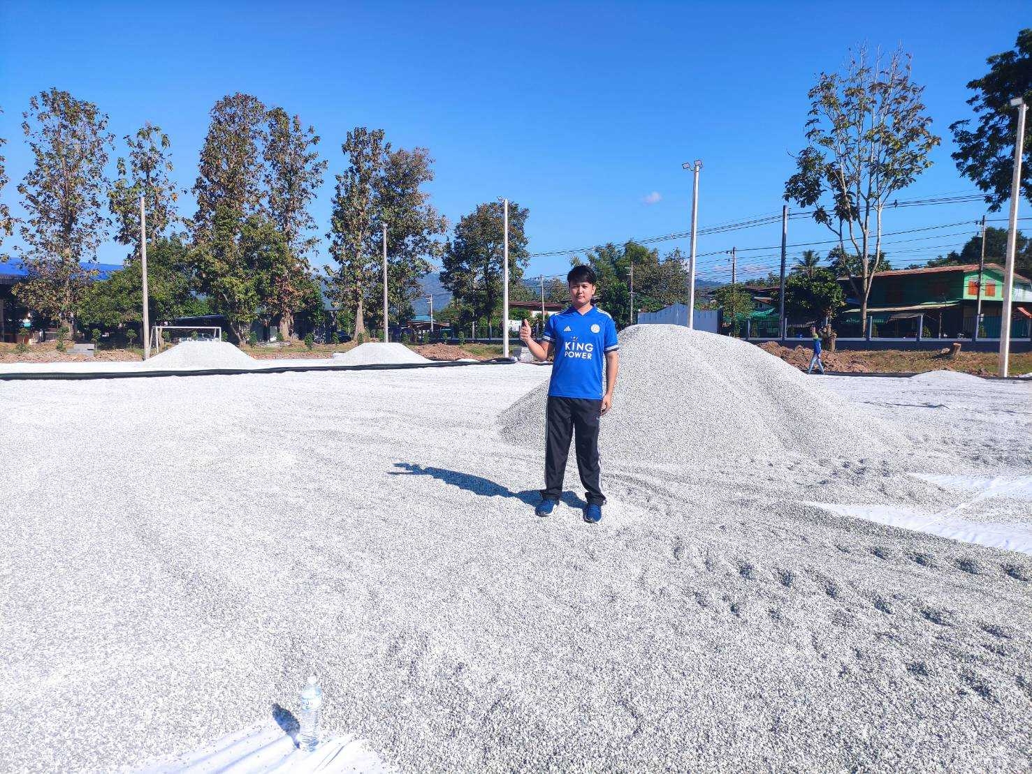 “สนามนี้เริ่มแรกเลยเกิดจากการที่โรงเรียนขาดอุปกรณ์กีฬาโดยเฉพาะลูกฟุตบอล และได้ยินข่าวว่ามีโครงการแจกลูกฟุตบอลจาก คิง เพาเวอร์ ที่ต่างอำเภอซึ่งไกลจากโรงเรียนประมาณ 100 กิโลเมตร เพื่อโอกาสของเด็กๆ ผมจึงเช่ารถ 6 ล้อ และพาเด็กๆ ไปรับลูกฟุตบอลที่อำเภอเนินมะปรางครับ เด็กๆ ได้รับลูกฟุตบอลกลับมาทันกิจกรรมที่โรงเรียนและที่บ้านคนละ 1 ลูกเพื่อฝึกทักษะฟุตบอล”