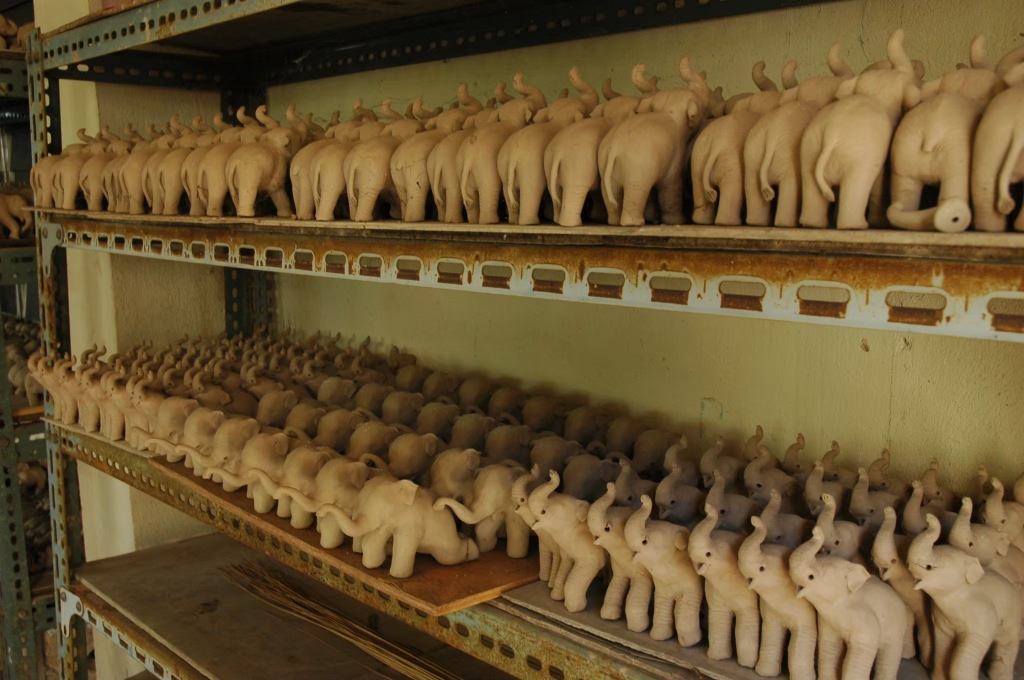 “ที่ทำออกมาตอนแรกจะเป็นช้างตัวใหญ่ รายละเอียดตัวช้างเยอะ มีทั้งช้างพลาย ช้างชูงวง ช้างดันซุงในอิริยาบถต่างๆ แต่พอทำไปได้ระยะหนึ่งมันเริ่มไม่เหมาะสมกับการขนส่งเพราะตัวใหญ่เกินไป ผลิตภัณฑ์แบบใหม่จึงเป็นช้างที่มีไซส์เล็กลง ส่วนรูปแบบของช้างก็มีหลายอิริยาบถเหมือนเดิม” จากช้างที่ออกแบบมาเพื่อเป็นของแต่งบ้านสูงประมาณยี่สิบเซนติเมตรก็ค่อยๆ ปรับเล็กลงเป็นของที่ระลึกแทน