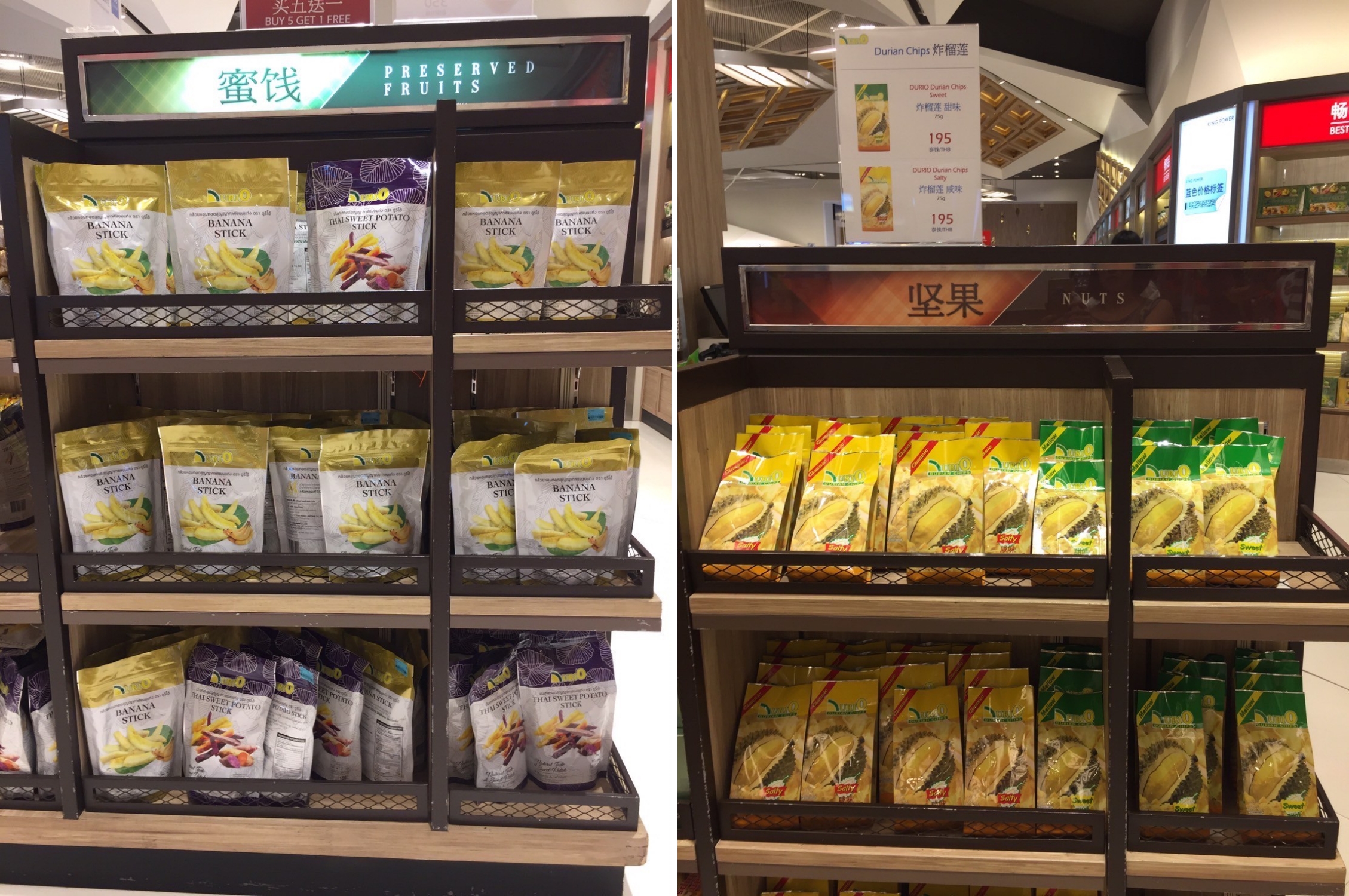 ปัจจุบัน Durio เข้ามาร่วมเป็นส่วนหนึ่งเพื่อนำเสนอสแน็กฝีมือคนไทยร่วมกับ คิง เพาเวอร์ มายาวนานกว่ายี่สิบปี ส่งออกความภูมิใจในฐานะแบรนด์คนไทย นำเสนอผลไม้ไทย และสินค้าผลไม้แปรรูปของไทยให้ชาวต่างชาติได้รู้จัก ได้ลิ้มลอง และซื้อติดมือกลับไปเพื่อเป็นของฝากให้กับคนที่รักได้ลิ้มรส