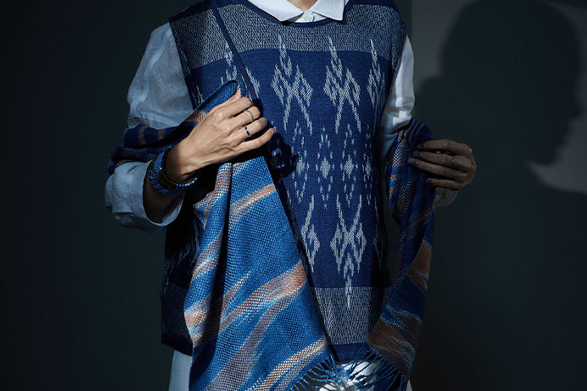 “คอลเลกชันนี้เราเน้นที่ผ้าขาวม้าที่ใช้เทคนิคการทอ 9 เส้น เพื่อความเชื่อมโยงกับรัชกาลที่ 9 ซึ่งเป็นสิ่งที่คนในชุมชนบ้านเขาเต่าภูมิใจด้วย แต่เราเอามาปรับเปลี่ยนโทนสีและช่องไฟให้มีความโมเดิร์นขึ้น คงเทคนิคการทอ 9 เส้นดั้งเดิมของเขาเหมือนเดิม”