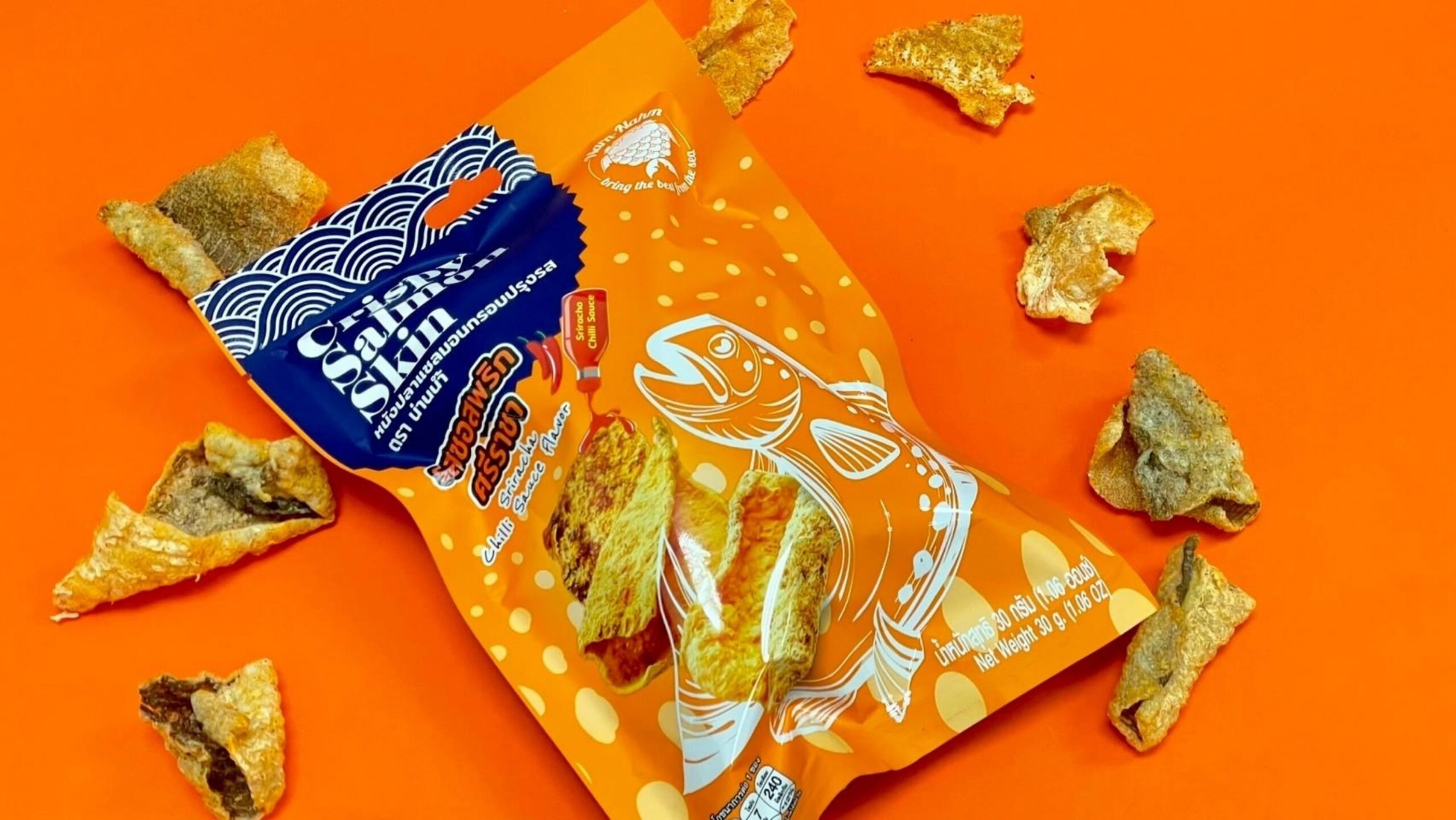 อีกหนึ่งโพรดักต์คือ หนังปลาแซลมอนอบกรอบ ที่ได้หนังปลาจากปลาแซลมอนเลี้ยงในไทย นำมาผ่านกระบวนการตัดให้เป็นชิ้นเล็กๆ ขนาด Bite Size สี่เหลี่ยมจัตุรัสให้กินง่าย นำไปตากแดดในโรงเรือนจนแห้ง จากนั้นนำมาทอดแล้วเข้าสู่กระบวนการอบเพื่อไล่น้ำมันออก นำมาคลุกกับผงปรุงรส และยังมีหมึกหยองปรุงรสที่นำมาคลุกกับผงปรุงหลากรสชาติ สินค้าทั้งหมดไม่ผสมแป้งเพื่อให้ผู้บริโภคได้รสชาติของวัตถุดิบธรรมชาติอย่างแท้จริง