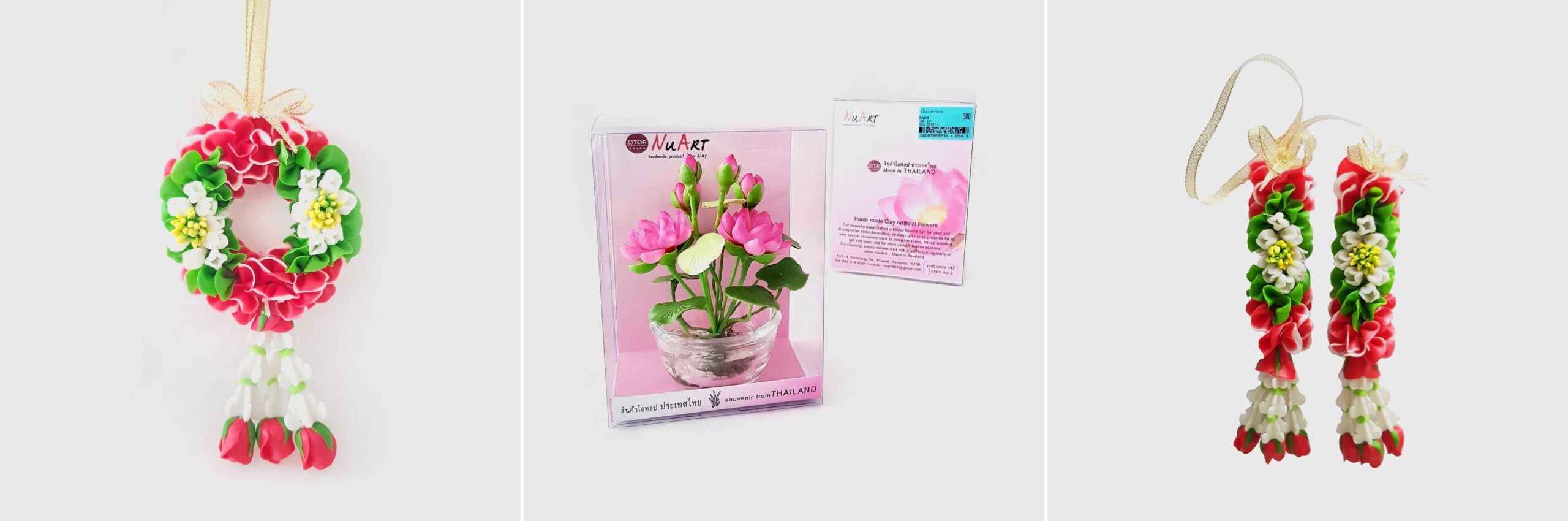 ผลิตภัณฑ์ดอกไม้ประดิษฐ์อย่างประณีตจากดินไทย ใส่ไอเดียและฝีมือเป็นของที่ระลึกสวยงามทั้งผลิตภัณฑ์และแพ็กเกจ เหมาะเป็นของขวัญตัวแทนของประเทศไทยเพื่อมอบให้ชาวต่างชาติ เป็นของฝากที่ถูกใจทั้งผู้ให้และผู้รับ สวยและคุณภาพดี…ทั้งดอกกล้วยไม้ ดอกบัว และพวงมาลัย