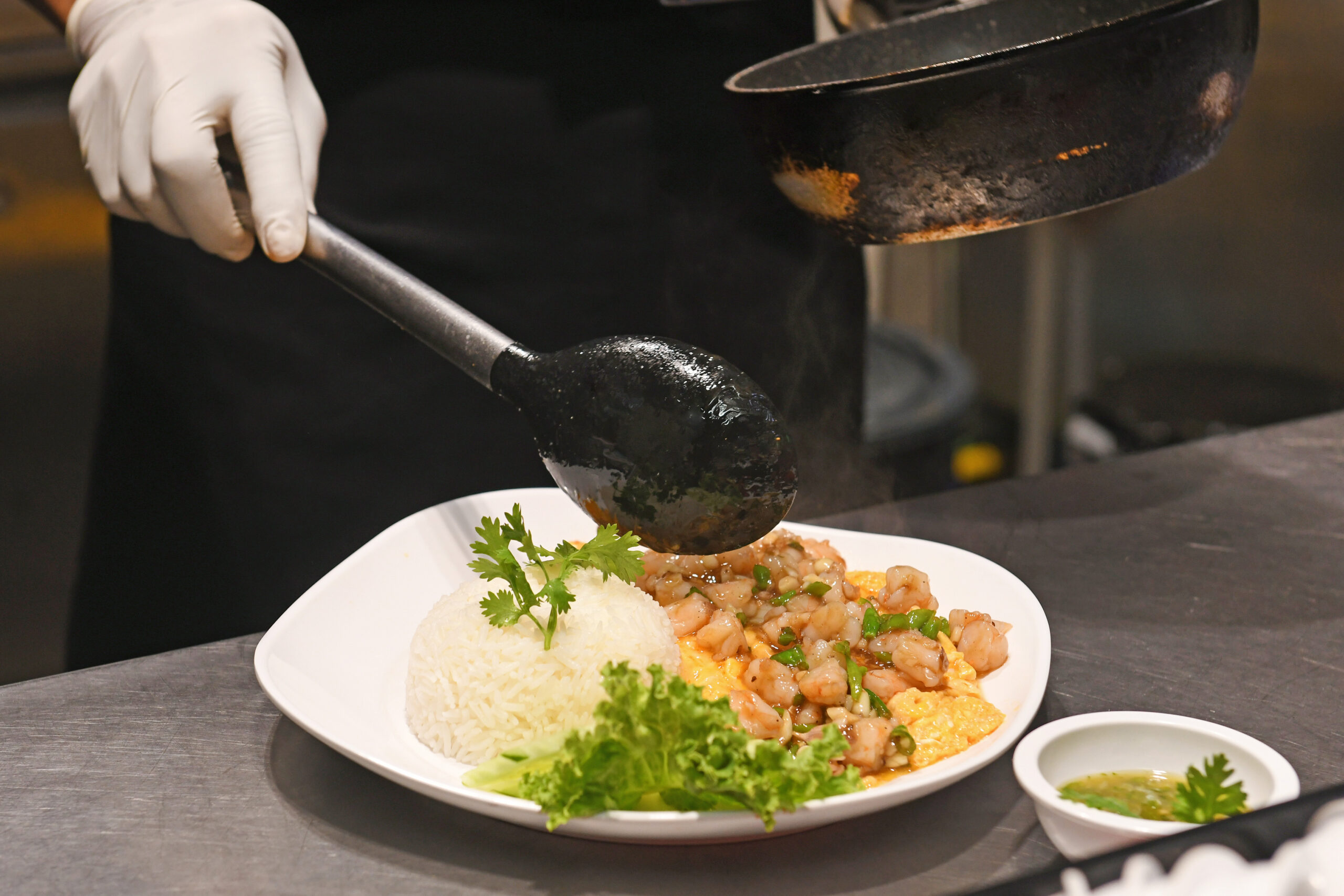 • ข้าวไข่ข้นกุ้งผัดพริกขี้หนู (160 บาท)